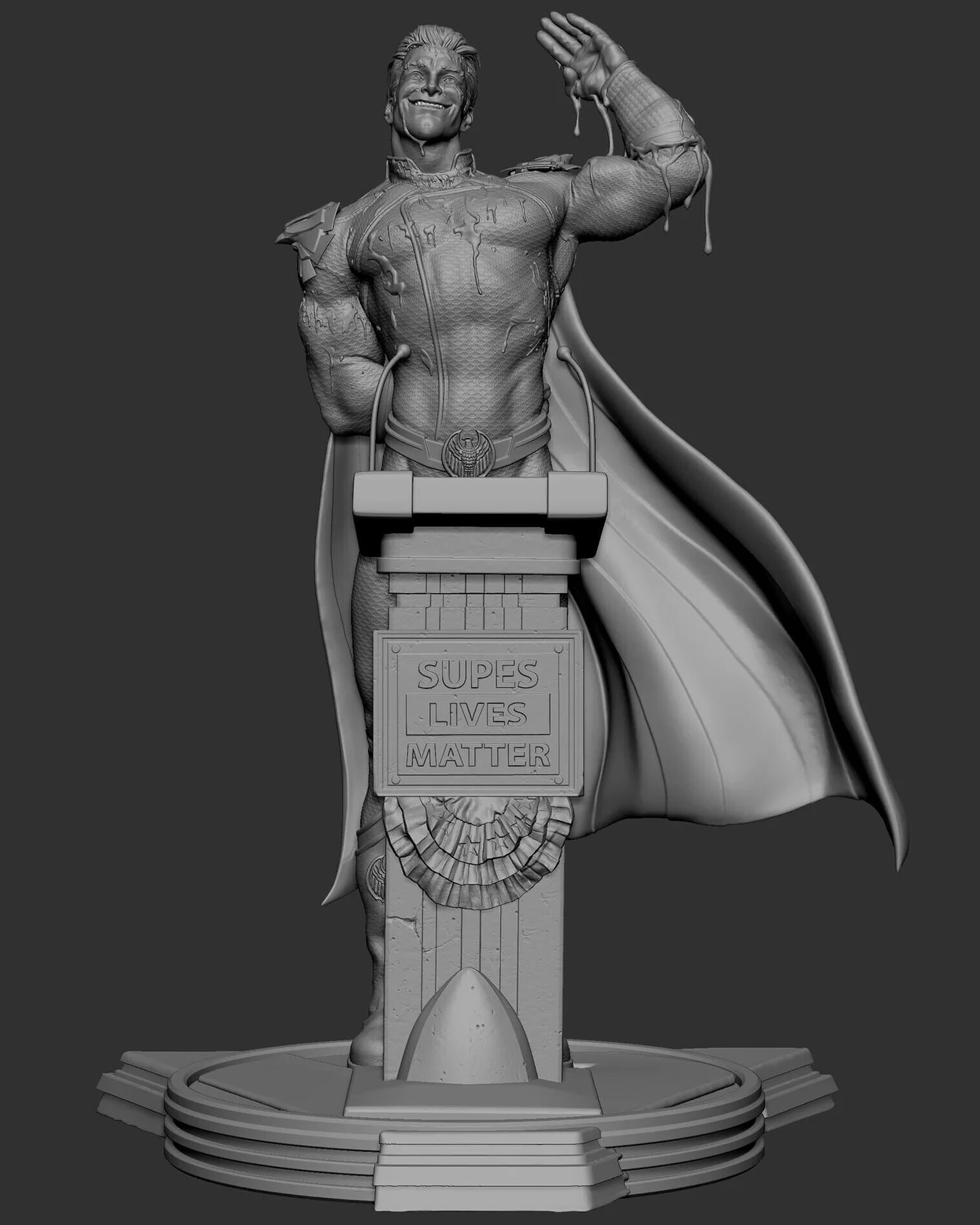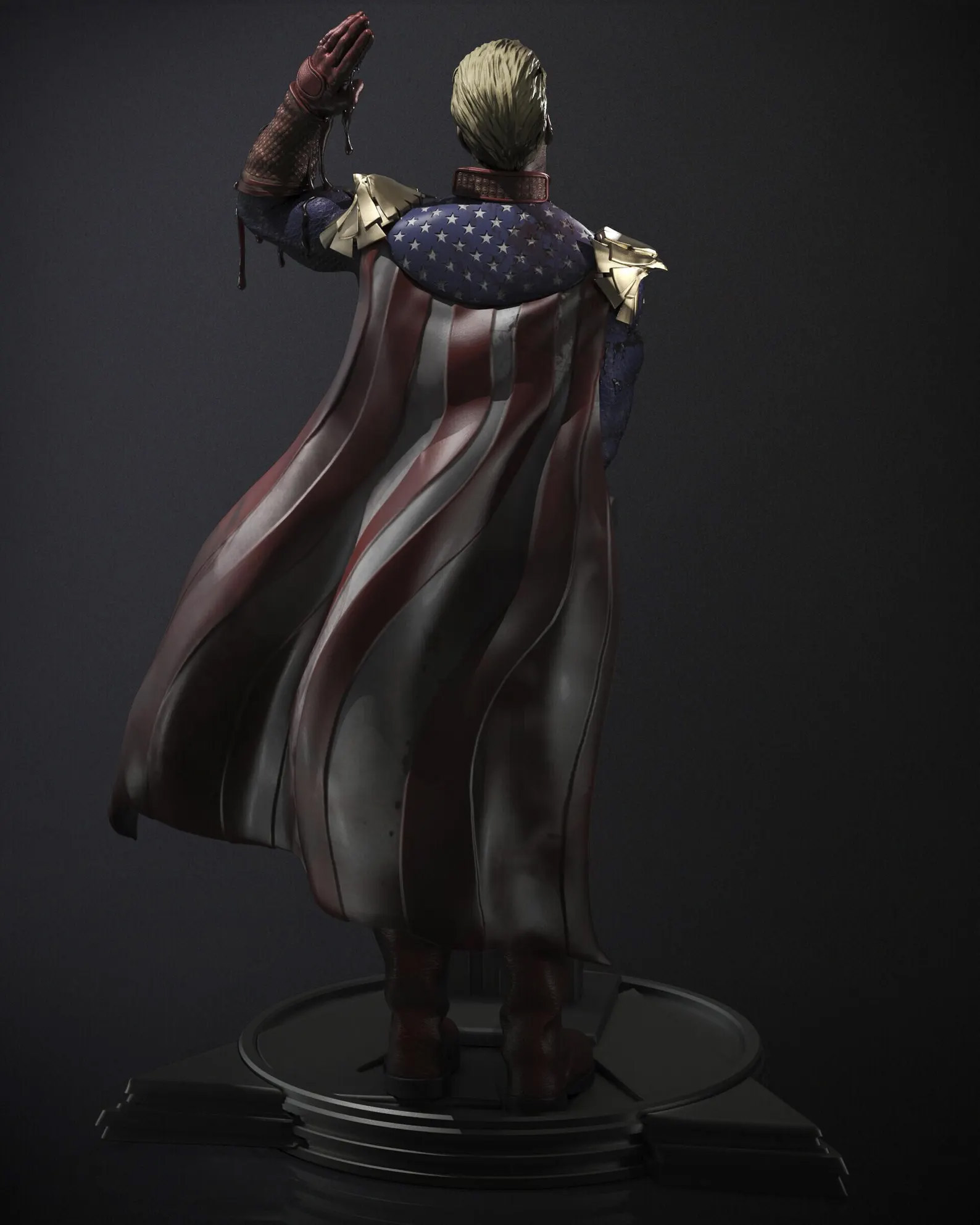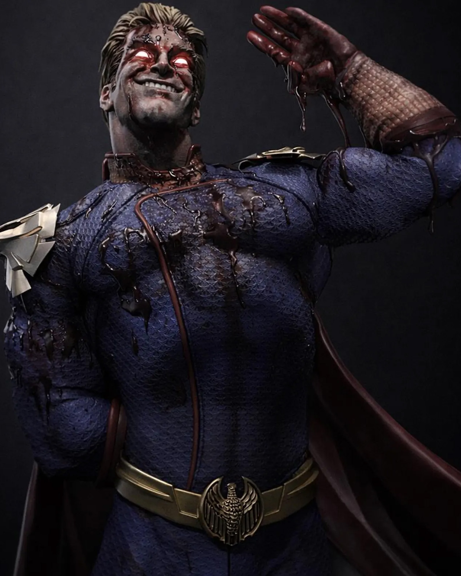 The figure shows Homelander in his iconic patriotic costume with one hand raised as though addressing a crowd. However, the blood across his face and body reveals the darker side of the character and creates a dramatic contrast between his public image and true nature.