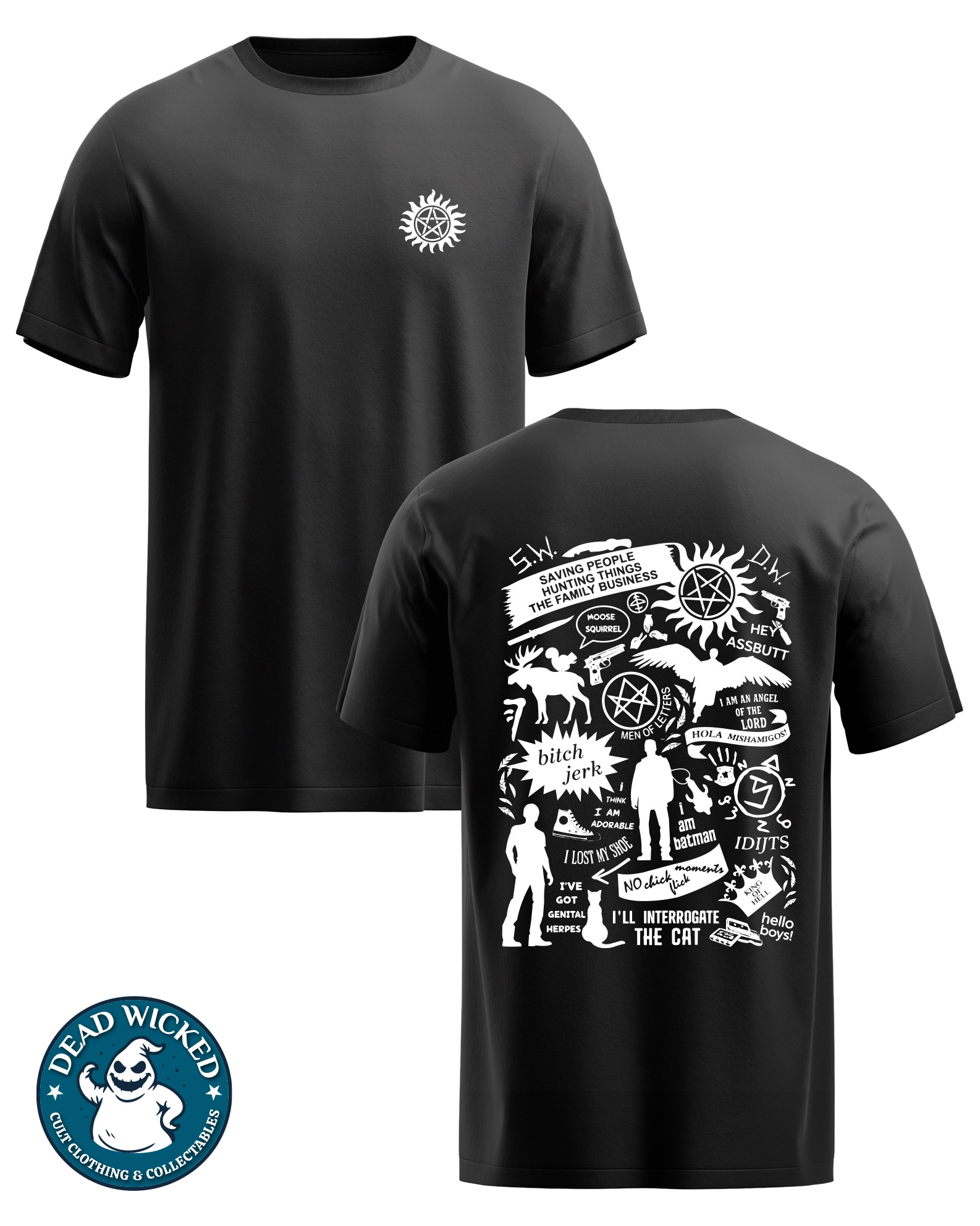 The Montage – Supernatural Printed T-Shirt celebrates one of television’s most iconic monster-hunting series. This bold graphic tee brings together famous quotes, symbols, and references from the legendary world of hunters, angels, and supernatural creatures. As a result, the design instantly captures the atmosphere fans recognise from the show.