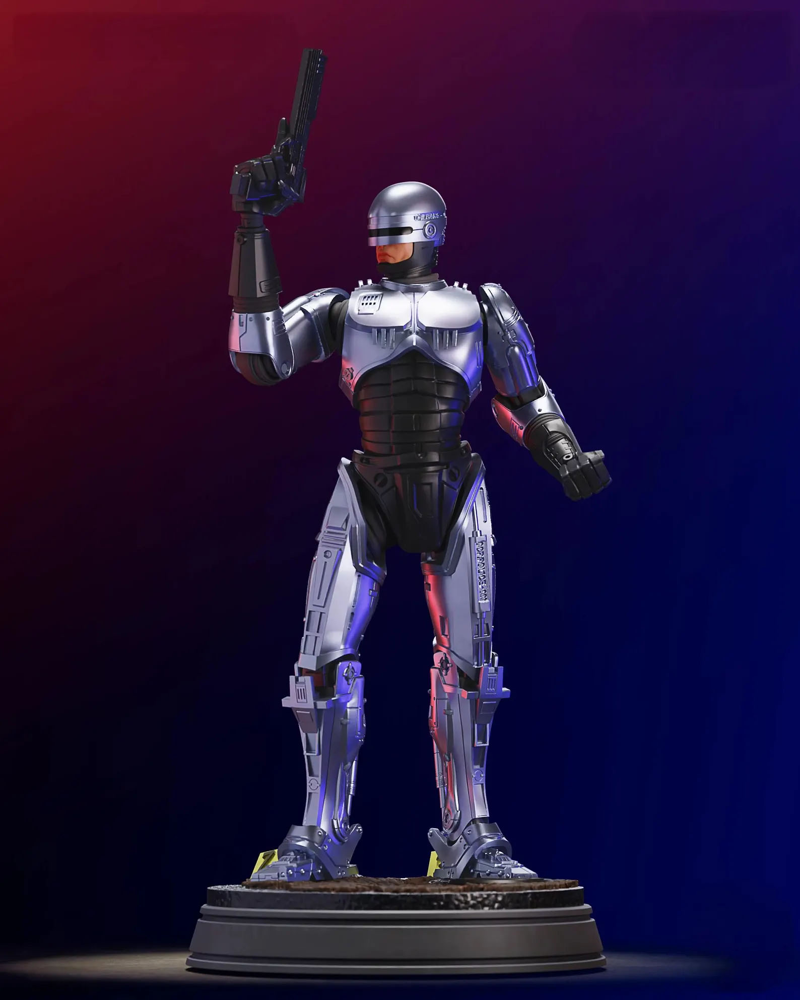 The dynamic stance creates a strong sense of authority. RoboCop raises one arm while holding his iconic pistol. Meanwhile, the other arm remains clenched at his side. Consequently, the model captures the feeling of RoboCop confronting criminals in Old Detroit.