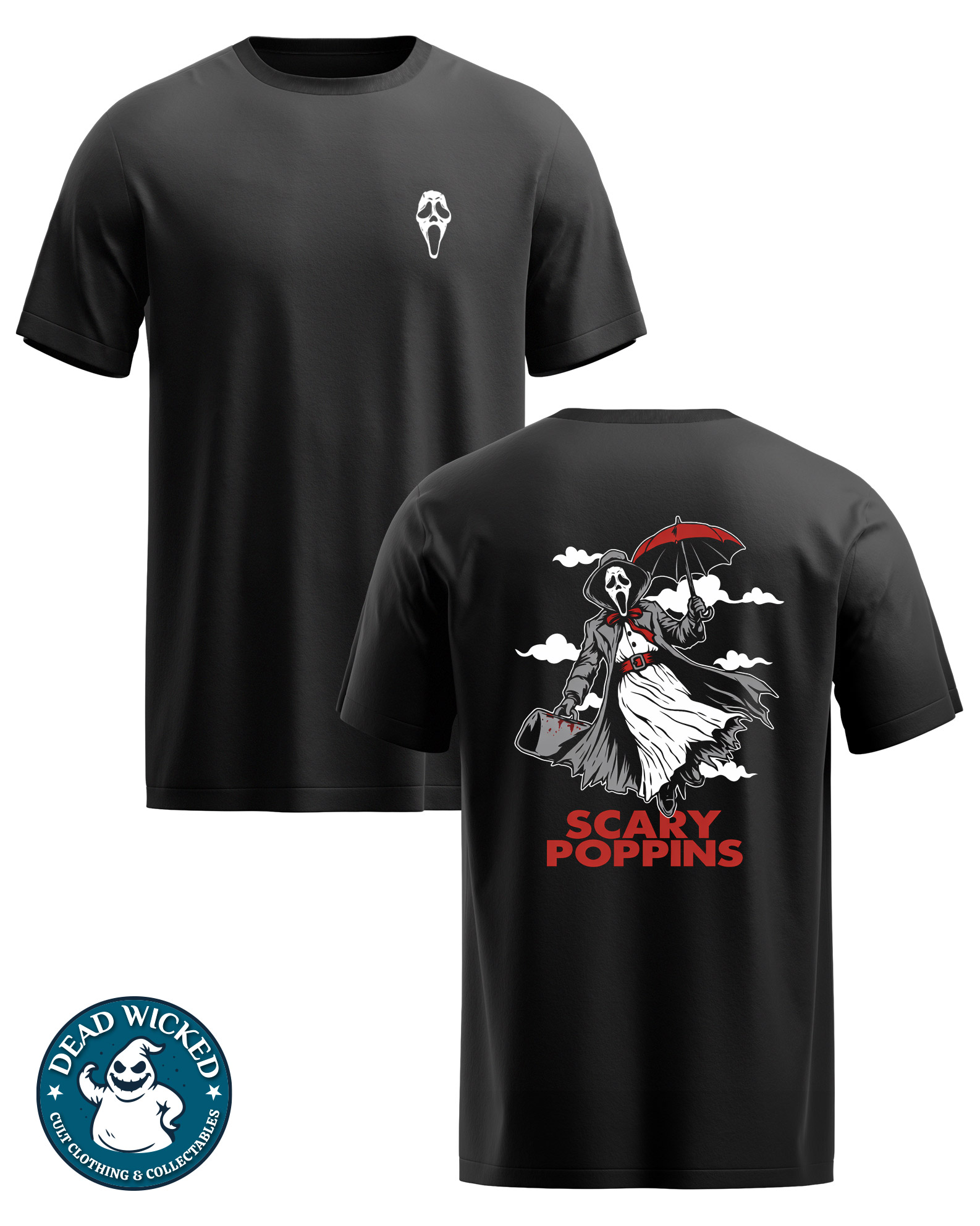 The Scary Poppins – Scream Printed T-Shirt uses a bold colour palette of black, white, and deep red. Therefore, the artwork stands out clearly on dark fabric. The limited colour scheme also gives the design a strong cinematic horror look.